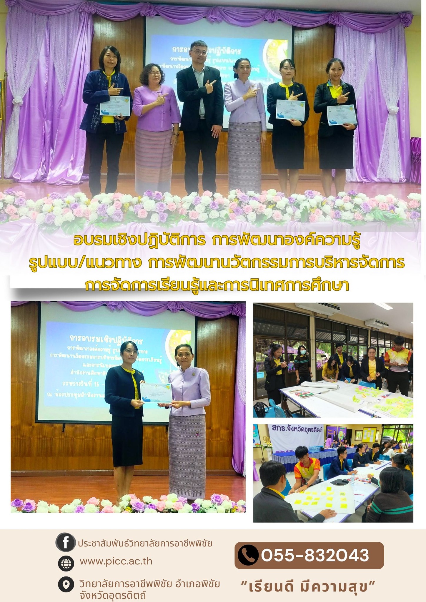 เมื่อระหว่างวันที่ 15-16 สิงหาคม 2667 นายเทียน รั้งกลาง ผู้อำนวยการวิทยาลัยการอาชีพพิชัย ได้มอบหมายให้ นางวาสนา สุขใจ เข้าร่วมการอบรมเชิงปฏิบัติการการพัฒนาองค์ความรู้รูปแบบ แนวทางการพัฒนานวัตกรรมการบริหารจัดการ การจัดการเรียนรู้และการนิเทศการศึกษา